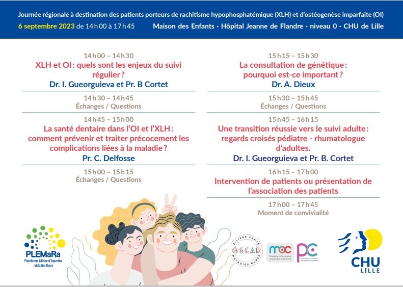 Cette journée régionale à destination des patients porteurs de rachitisme hypophosphatémique (XLH) et d’ostéogenèse imparfaite (OI) est organisée par le Dr I. Gueorguieva (pédiatre) et Pr. B. Cortet (rhumatologue) avec le soutien de PLEMaRa, du CHU de Lille et de la filière Oscar.
